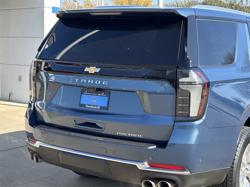 VEHICLE DETAILED, RECENT OIL CHANGE, PASSED DEALER INSPECTION, 4WD, Gideon/Very Dark Atmosphere w/Leather-Appointed Seat Trim.CARFAX One-Owner. Clean CARFAX.Certified. Chevrolet Certified Pre-Owned Details:* Transferable Warranty* 172 Point Inspection* Powertrain Limited Warranty: 72 Month/100,000 Mile (whichever comes first) from original in-service date* Limited Warranty: 12 Month/12,000 Mile (whichever comes first) from certified purchase date* Vehicle History* Roadside Assistance* 24 months/24,000 miles (whichever comes first) Certified Pre-Owned Scheduled Maintenance Plan and 3 days/150 miles (whichever comes first) Vehicle Exchange Program. SiriusXM 3-month trial subscription.* Warranty Deductible: $04D Sport Utility Lakeshore Blue Metallic 2025 Chevrolet Tahoe Premier 15/20 City/Highway MPG EcoTec3 5.3L V8 10-Speed Automatic with Overdrive 4WDBENEFITS OF BUYING CERTIFIED: Roadside Assistance 172 Point Inspection Powertrain Limited Warranty: 72 Month/100,000 Mile (whichever comes first) from original in-service date 24 months/24,000 miles (whichever comes first) CPO Scheduled Maintenance Plan SiriusXM 3-month trial subscription Limited Warranty: 12 Month/12,000 Mile (whichever comes first) from certified purchase date AND MORE!!! We will be more than happy to answer any questions you may have, send you additional photos, or set you an appointment to see it in person from our Product Specialist. Please call at (817) 305-7391! All vehicles must pass state inspection and meet all safety standards prior to finalization of sale. Prices are fluid and change daily due to market conditions or reconditioning needs to meet retail standards. We do not hold cars, its first come first serve so call now while its here! The price offerings on this web site constitute a private offer not available to the general public. To qualify for these prices, you must print the screen for the vehicle selected and present it in person. ! ! ! Call today (682)-301-7391 ! ! !