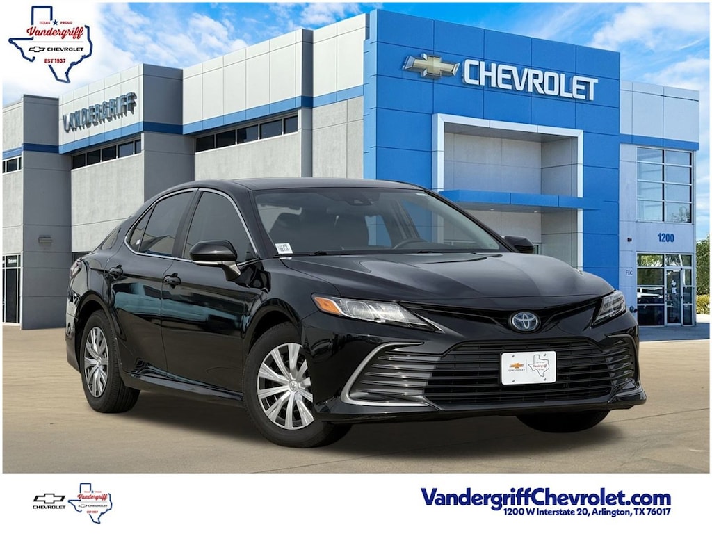 VEHICLE DETAILED, RECENT OIL CHANGE, PASSED DEALER INSPECTION, 2.5L I4 DOHC 16V.4D Sedan Midnight Black Metallic 2023 Toyota Camry Hybrid LE 51/53 City/Highway MPG Odometer is 8055 miles below market average! 2.5L I4 DOHC 16V eCVT FWDVandergriff Chevrolet has been Dealer of the Year since 2018!!! Here at Vandergriff Chevrolet you will find low cost and affordable gas saving used pre owned and certified pre owned along with luxury pre owned!! We have it all, if you donât see what you are looking for WE CAN LOCATE IT. Our showroom amenities and service drive are open extended hours for your convenience. Please stop by and see why were the BEST PLACE to buy your next new or used Chevrolet, EMPLOYEE PRICING FOR EVERYONE HURRY! Visit our REDESIGNED State-of-the-Art Dealership. Not to mention a HUGE selection of New Pre-Owned vehicles will make Vandergriff Chevrolet your premiere choice for Chevrolet dealerships in the Dallas Fort Worth area. Stop by and see why we are where DFW SHOPS FOR USED CARS Customer Requested and Dealer Added Options are extra. Serving the DFW Metroplex for over 80 Years, Vandergriff Chevrolet located at 1200 W. I-20 in Arlington TX is your premier retailer of new and used Chevrolet vehicles. Our dedicated sales staff and top-trained technicians are here to make your shopping and service experience fun, easy and financially advantageous. Please utilize our various online resources and allow our excellent network of people to put you in your ideal car truck or SUV today. Serving Arlington Grand Prairie Forth Worth Mansfield Burleson Irving Hurst Euless Bedford Plano McKinney Tyler Midlothian Weatherford Grapevine Frisco Little Elm Irving Grapevine Dallas The colony Waxahachie Austin Houston and many other outlining cities. The Vandergriff Protection Package adds great peace of mind knowing that the vehicle has been inspected and reconditioned. All vehicles must pass state inspection and meet all safety standards prior to finalization of sale. Prices are fluid and change daily due to market conditions or reconditioning needs to meet retail standards. We do not hold cars, it's first come first serve so call now while it's here! ! ! ! Call today (682)-301-7391 ! ! !